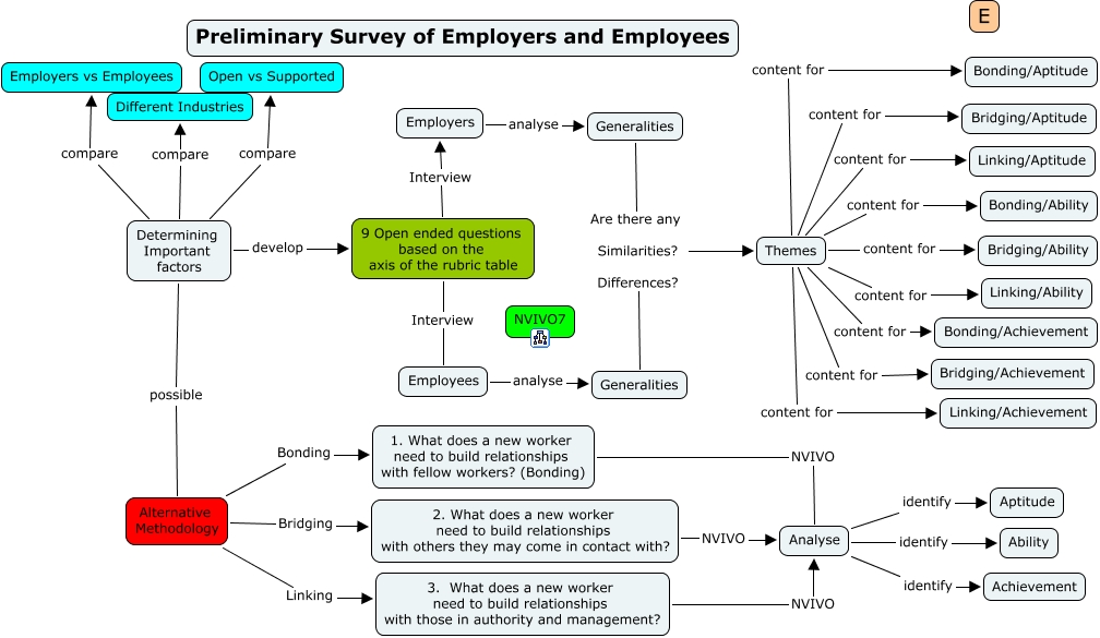 This Concept Map, created with IHMC CmapTools, has information related to: Important factors, Determining Important factors possible Alternative Methodology, 9 Open ended questions based on the axis of the rubric table Interview Employees, Generalities Are there any Similarities? Differences? Generalities, Alternative Methodology Linking 3. What does a new worker need to build relationships with those in authority and management?, Themes content for Bridging/Achievement, Alternative Methodology Bonding 1. What does a new worker need to build relationships with fellow workers? (Bonding), Themes content for Linking/Ability, 3. What does a new worker need to build relationships with those in authority and management? NVIVO Analyse, Themes content for Bonding/Aptitude, Themes content for Linking/Aptitude, 2. What does a new worker need to build relationships with others they may come in contact with? NVIVO Analyse, Analyse identify Achievement, Determining Important factors compare Employers vs Employees, 1. What does a new worker need to build relationships with fellow workers? (Bonding) NVIVO Analyse, Analyse identify Aptitude, Analyse identify Ability, Determining Important factors develop 9 Open ended questions based on the axis of the rubric table, Employers analyse Generalities, Themes content for Bonding/Ability, 9 Open ended questions based on the axis of the rubric table Interview Employers