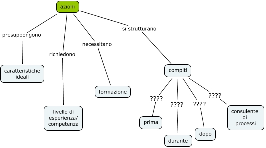 This Concept Map, created with IHMC CmapTools, has information related to: AZIONI, azioni presuppongono caratteristiche ideali, compiti ???? durante, compiti ???? consulente di processi, compiti ???? dopo, azioni richiedono livello di esperienza/ competenza, azioni si strutturano compiti, azioni necessitano formazione, compiti ???? prima