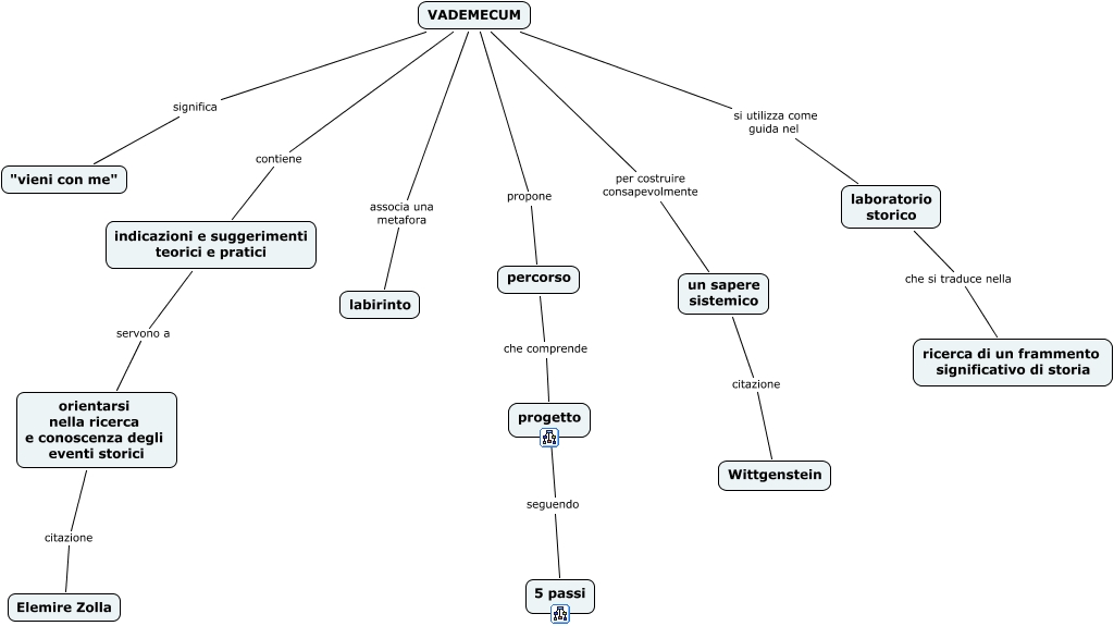 This Concept Map, created with IHMC CmapTools, has information related to: VADEMECUM_DI_STORIA, VADEMECUM associa una metafora labirinto, VADEMECUM contiene indicazioni e suggerimenti teorici e pratici, laboratorio storico che si traduce nella ricerca di un frammento significativo di storia, indicazioni e suggerimenti teorici e pratici servono a orientarsi nella ricerca e conoscenza degli eventi storici, VADEMECUM propone percorso, VADEMECUM si utilizza come guida nel laboratorio storico, orientarsi nella ricerca e conoscenza degli eventi storici citazione Elemire Zolla, VADEMECUM significa "vieni con me", progetto seguendo 5 passi, VADEMECUM per costruire consapevolmente un sapere sistemico, un sapere sistemico citazione Wittgenstein, percorso che comprende progetto