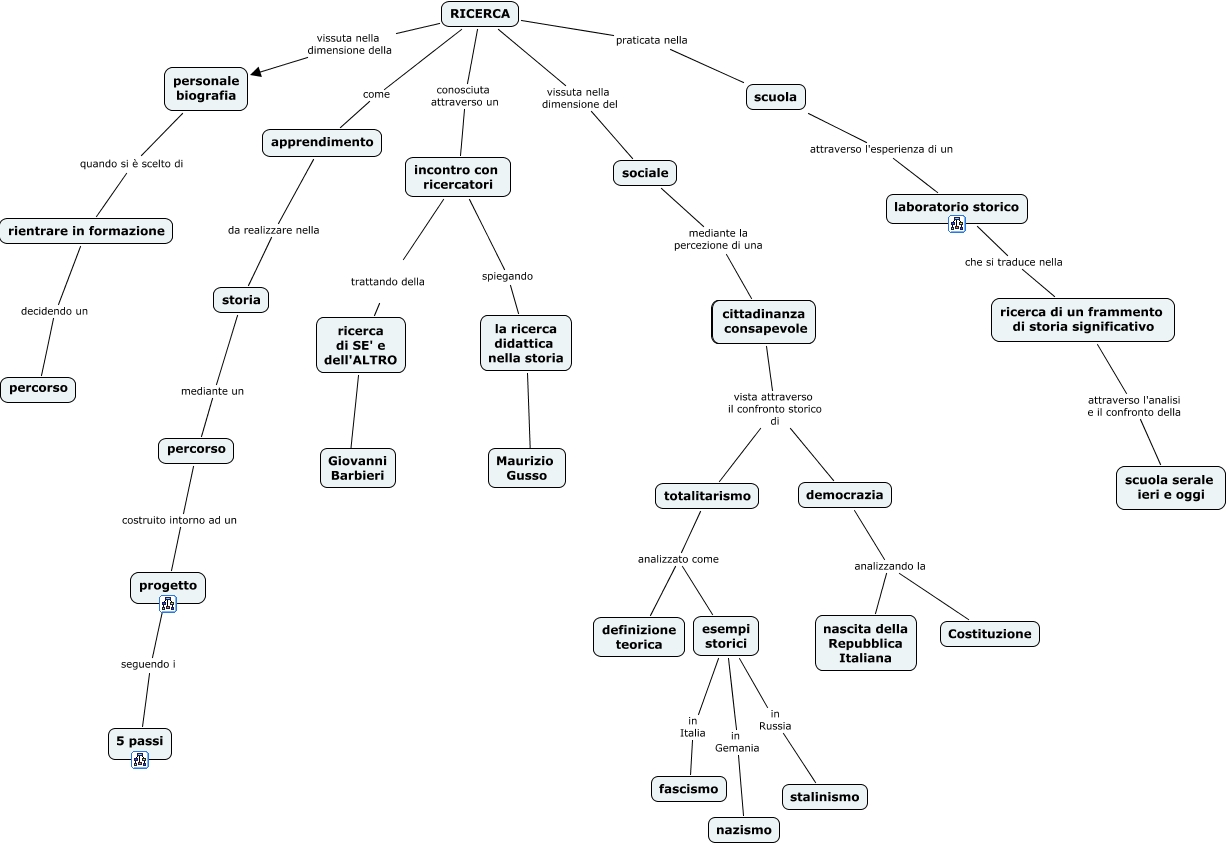 This Concept Map, created with IHMC CmapTools, has information related to: LA_STORIA_IN_CLASSE_COME_P, la ricerca didattica nella storia ???? Maurizio Gusso, cittadinanza consapevole vista attraverso il confronto storico di democrazia, cittadinanza consapevole vista attraverso il confronto storico di totalitarismo, progetto seguendo i 5 passi, esempi storici in Gemania nazismo, esempi storici in Italia fascismo, incontro con ricercatori spiegando la ricerca didattica nella storia, ricerca di SE' e dell'ALTRO ???? Giovanni Barbieri, democrazia analizzando la nascita della Repubblica Italiana, totalitarismo analizzato come esempi storici, ricerca di un frammento di storia significativo attraverso l'analisi e il confronto della scuola serale ieri e oggi, storia mediante un percorso, RICERCA praticata nella scuola, RICERCA vissuta nella dimensione della personale biografia, RICERCA conosciuta attraverso un incontro con ricercatori, percorso costruito intorno ad un progetto, totalitarismo analizzato come definizione teorica, scuola attraverso l'esperienza di un laboratorio storico, apprendimento da realizzare nella storia, personale biografia quando si è scelto di rientrare in formazione