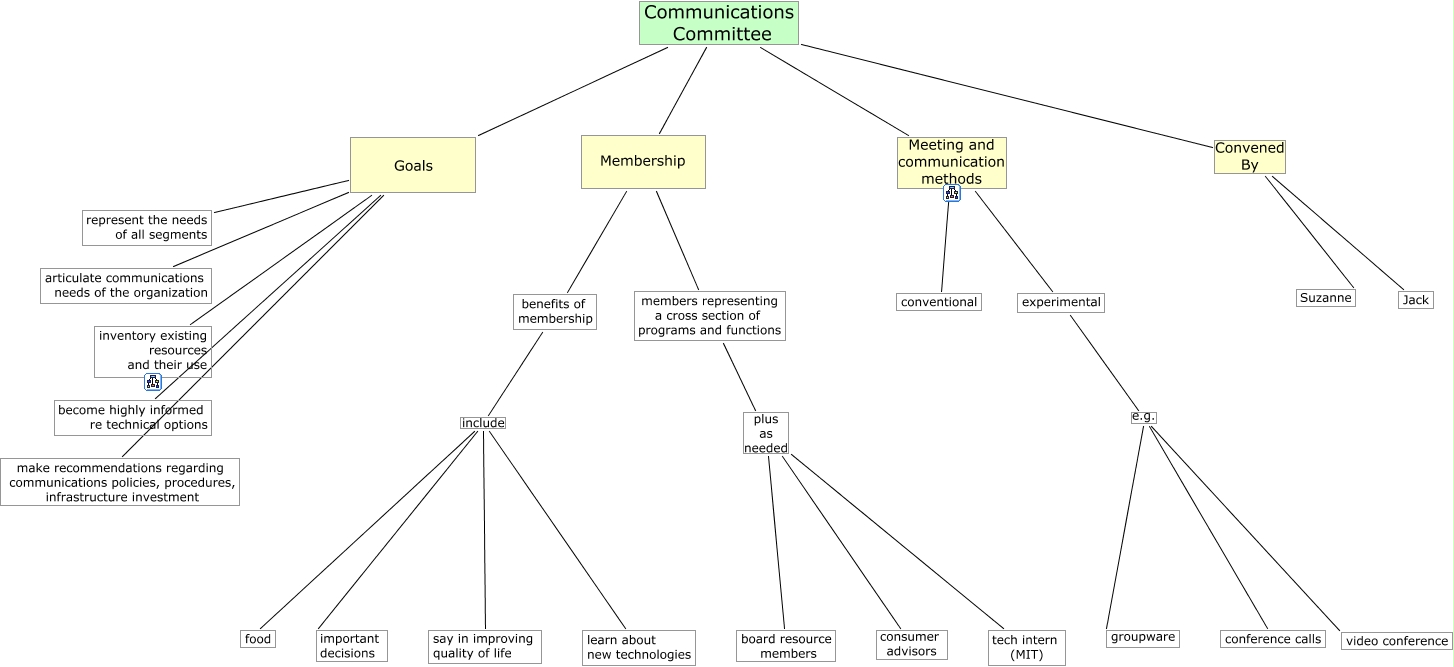 This Concept Map, created with IHMC CmapTools, has information related to: Communications Committee, Communications Committee Goals become highly informed re technical options, Communications Committee Goals make recommendations regarding communications policies, procedures, infrastructure investment, benefits of membership include learn about new technologies, members representing a cross section of programs and functions plus as needed consumer advisors, benefits of membership include food, experimental e.g. groupware, benefits of membership include say in improving quality of life, Communications Committee Meeting and communication methods conventional, benefits of membership include important decisions, Communications Committee Goals inventory existing resources and their use, Communications Committee Membership benefits of membership, Communications Committee Goals represent the needs of all segments, Communications Committee Convened By Suzanne, Communications Committee Convened By Jack, members representing a cross section of programs and functions plus as needed tech intern (MIT), experimental e.g. conference calls, Communications Committee Meeting and communication methods experimental, Communications Committee Goals articulate communications needs of the organization, experimental e.g. video conference, members representing a cross section of programs and functions plus as needed board resource members