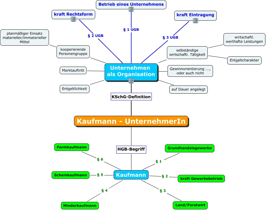 This Concept Map, created with IHMC CmapTools, has information related to: Kaufmann-Unternehmen, Kaufmann § 3 Land/Forstwirt, Kaufmann § 1 Grundhandelsgewerbe, Unternehmen als Organisation Marktauftritt, Unternehmen als Organisation kooperierende Personengruppe, Unternehmen als Organisation § 3 UGB kraft Eintragung, Kaufmann § 4 Minderkaufmann, selbständige wirtschaftl. Tätigkeit wirtschaftl. werthafte Leistungen, kooperierende Personengruppe planmäßiger Einsatz materieller/immaterieller Mittel, Kaufmann - UnternehmerIn HGB-Begriff Kaufmann, Unternehmen als Organisation auf Dauer angelegt, Kaufmann - UnternehmerIn KSchG-Definition Unternehmen als Organisation, Unternehmen als Organisation § 2 UGB kraft Rechtsform, Kaufmann § 2 kraft Gewerbebetrieb, Kaufmann § 6 Formkaufmann, Kaufmann § 5 Scheinkaufmann, Unternehmen als Organisation § 1 UGB Betrieb eines Unternehmens, Unternehmen als Organisation selbständige wirtschaftl. Tätigkeit, Unternehmen als Organisation Entgeltlichkeit, selbständige wirtschaftl. Tätigkeit Entgeltcharakter, Unternehmen als Organisation Gewinnorientierung ..., oder auch nicht