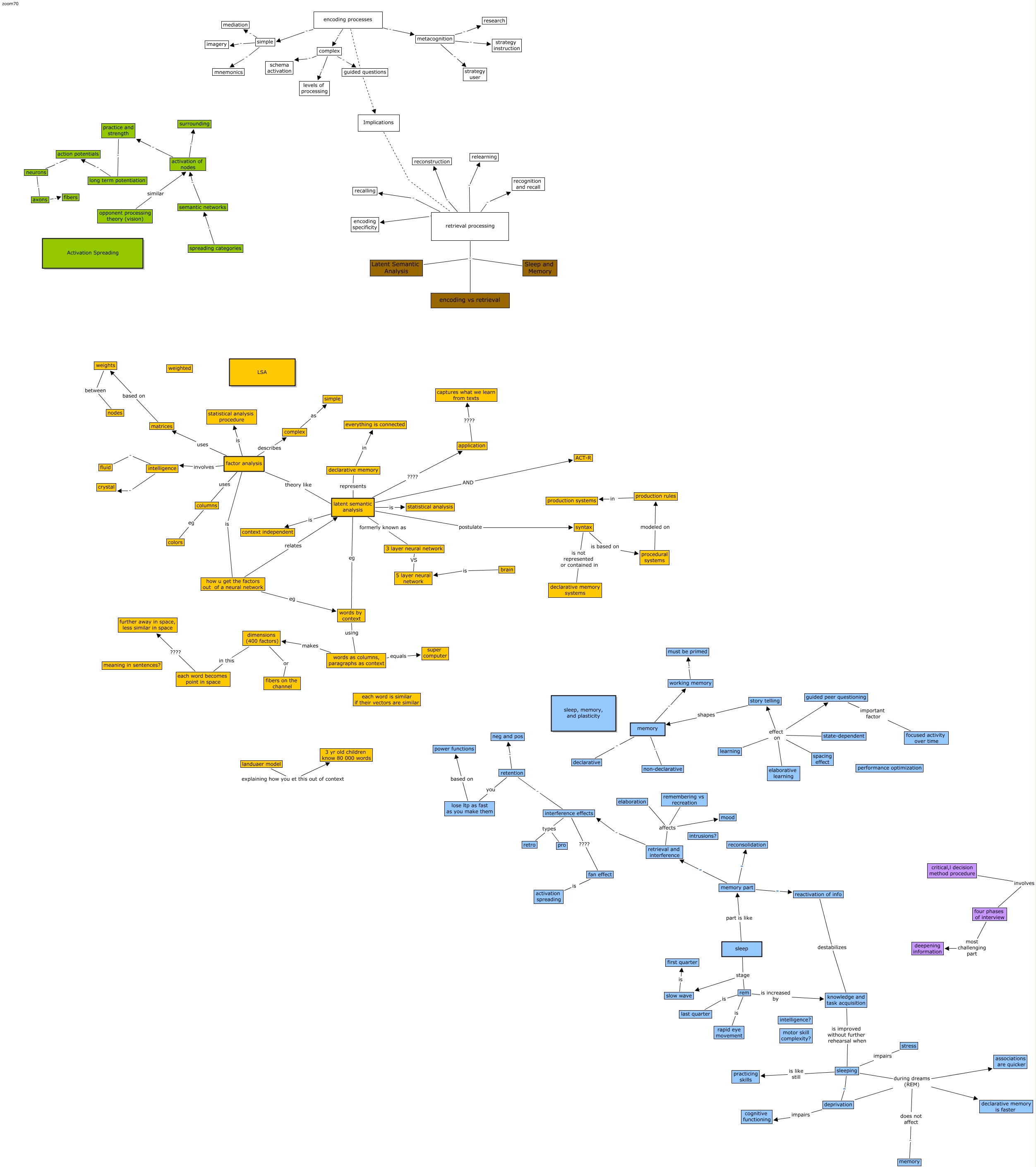 This Concept Map, created with IHMC CmapTools, has information related to: fri.notes retrieval-encoding, slow wave is first quarter, encoding processes . simple, latent semantic analysis eg words by context, latent semantic analysis formerly known as 3 layer neural network, syntax is based on procedural systems, retention you lose ltp as fast as you make them, latent semantic analysis is context independent, syntax is not represented or contained in declarative memory systems, sleeping . deprivation, deprivation during dreams (REM) does not affect, latent semantic analysis ???? application, intelligence . fluid, elaboration affects mood, words as columns, paragraphs as context makes dimensions (400 factors), sleep stage rem, dimensions (400 factors) in this each word becomes point in space, spreading categories . semantic networks, metacognition . research, factor analysis is how u get the factors out of a neural network, latent semantic analysis is statistical analysis