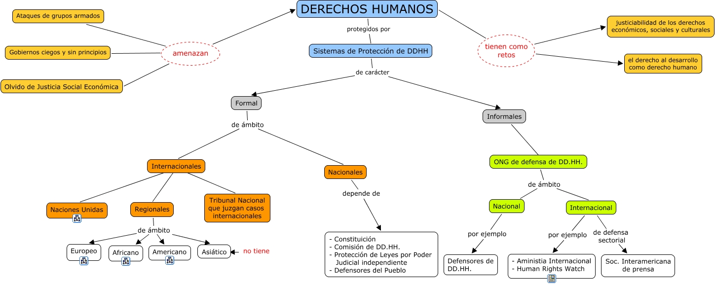 This Concept Map, created with IHMC CmapTools, has information related to: Sistemas de Protección de DDHH, Gobiernos ciegos y sin principios amenazan DERECHOS HUMANOS, DERECHOS HUMANOS protegidos por Sistemas de Protección de DDHH, Formal de ámbito Nacionales, Informales como ONG de defensa de DD.HH., Internacionales ???? Tribunal Nacional que juzgan casos internacionales, DERECHOS HUMANOS tienen como retos justiciabilidad de los derechos económicos, sociales y culturales, Regionales de ámbito Africano, Internacionales ???? Naciones Unidas, Formal de ámbito Internacionales, Regionales de ámbito Asiático, no tiene Asiático, Internacionales ???? Regionales, Internacional por ejemplo - Aministia Internacional - Human Rights Watch, Gobiernos ciegos y sin principios amenazan Olvido de Justicia Social Económica, Ataques de grupos armados amenazan DERECHOS HUMANOS, Regionales de ámbito Europeo, ONG de defensa de DD.HH. de ámbito Internacional, ONG de defensa de DD.HH. de ámbito Nacional, Sistemas de Protección de DDHH de carácter Informales, Nacional por ejemplo Defensores de DD.HH.