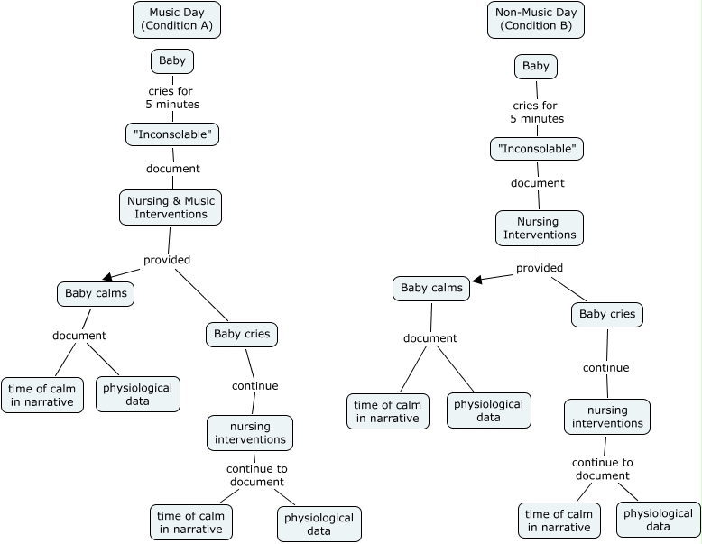 This Concept Map, created with IHMC CmapTools, has information related to: NICU, Baby cries continue nursing interventions, "Inconsolable" document Nursing & Music Interventions, Baby cries continue nursing interventions, nursing interventions continue to document time of calm in narrative, Nursing Interventions provided Baby calms, Baby calms document physiological data, nursing interventions continue to document physiological data, Nursing & Music Interventions provided Baby calms, Nursing & Music Interventions provided Baby cries, "Inconsolable" document Nursing Interventions, Baby cries for 5 minutes "Inconsolable", nursing interventions continue to document time of calm in narrative, nursing interventions continue to document physiological data, Baby calms document time of calm in narrative, Baby cries for 5 minutes "Inconsolable", Baby calms document time of calm in narrative, Baby calms document physiological data, Nursing Interventions provided Baby cries
