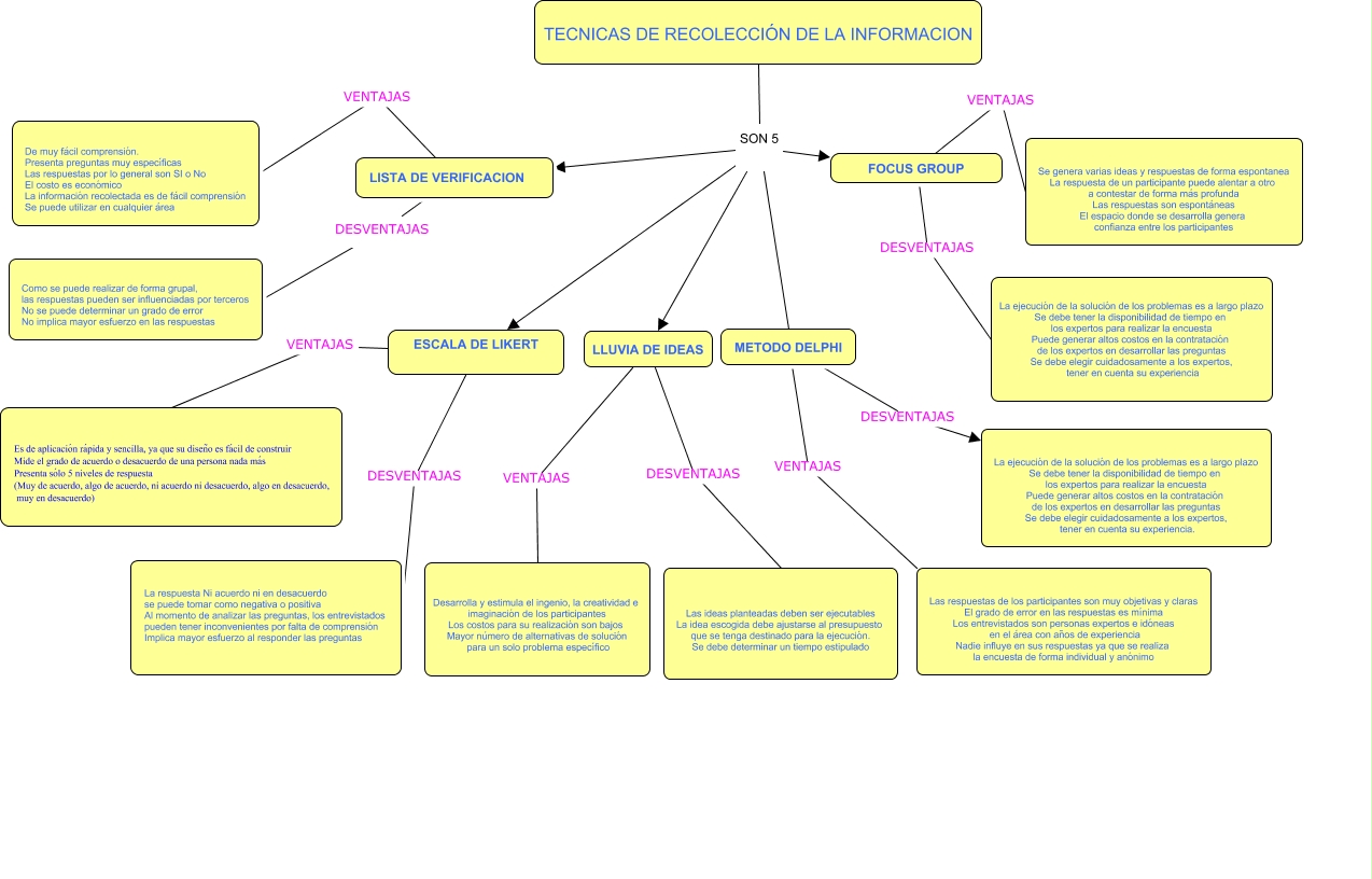 Este Cmap, tiene información relacionada con: La Educacion digital, ESCALA DE LIKERT DESVENTAJAS La respuesta Ni acuerdo ni en desacuerdo se puede tomar como negativa o positiva Al momento de analizar las preguntas, los entrevistados pueden tener inconvenientes por falta de comprensión Implica mayor esfuerzo al responder las preguntas, TECNICAS DE RECOLECCIÓN DE LA INFORMACION SON 5 ESCALA DE LIKERT, LISTA DE VERIFICACION DESVENTAJAS Como se puede realizar de forma grupal, las respuestas pueden ser influenciadas por terceros No se puede determinar un grado de error No implica mayor esfuerzo en las respuestas, FOCUS GROUP DESVENTAJAS La ejecución de la solución de los problemas es a largo plazo Se debe tener la disponibilidad de tiempo en los expertos para realizar la encuesta Puede generar altos costos en la contratación de los expertos en desarrollar las preguntas Se debe elegir cuidadosamente a los expertos, tener en cuenta su experiencia, ESCALA DE LIKERT VENTAJAS Es de aplicación rápida y sencilla, ya que su diseño es fácil de construir Mide el grado de acuerdo o desacuerdo de una persona nada más Presenta sólo 5 niveles de respuesta (Muy de acuerdo, algo de acuerdo, ni acuerdo ni desacuerdo, algo en desacuerdo, muy en desacuerdo), TECNICAS DE RECOLECCIÓN DE LA INFORMACION SON 5 FOCUS GROUP, LISTA DE VERIFICACION VENTAJAS De muy fácil comprensión. Presenta preguntas muy específicas Las respuestas por lo general son SI o No El costo es económico La información recolectada es de fácil comprensión Se puede utilizar en cualquier área, LLUVIA DE IDEAS VENTAJAS Desarrolla y estimula el ingenio, la creatividad e imaginación de los participantes Los costos para su realización son bajos Mayor número de alternativas de solución para un solo problema específico, TECNICAS DE RECOLECCIÓN DE LA INFORMACION SON 5 LLUVIA DE IDEAS, FOCUS GROUP VENTAJAS Se genera varias ideas y respuestas de forma espontanea La respuesta de un participante puede alentar a otro a contestar de forma más profunda Las respuestas son espontáneas El espacio donde se desarrolla genera confianza entre los participantes, TECNICAS DE RECOLECCIÓN DE LA INFORMACION SON 5 METODO DELPHI, TECNICAS DE RECOLECCIÓN DE LA INFORMACION SON 5 LISTA DE VERIFICACION, METODO DELPHI DESVENTAJAS La ejecución de la solución de los problemas es a largo plazo Se debe tener la disponibilidad de tiempo en los expertos para realizar la encuesta Puede generar altos costos en la contratación de los expertos en desarrollar las preguntas Se debe elegir cuidadosamente a los expertos, tener en cuenta su experiencia., METODO DELPHI VENTAJAS Las respuestas de los participantes son muy objetivas y claras El grado de error en las respuestas es mínima Los entrevistados son personas expertos e idóneas en el área con años de experiencia Nadie influye en sus respuestas ya que se realiza la encuesta de forma individual y anónimo, LLUVIA DE IDEAS DESVENTAJAS Las ideas planteadas deben ser ejecutables La idea escogida debe ajustarse al presupuesto que se tenga destinado para la ejecución. Se debe determinar un tiempo estipulado