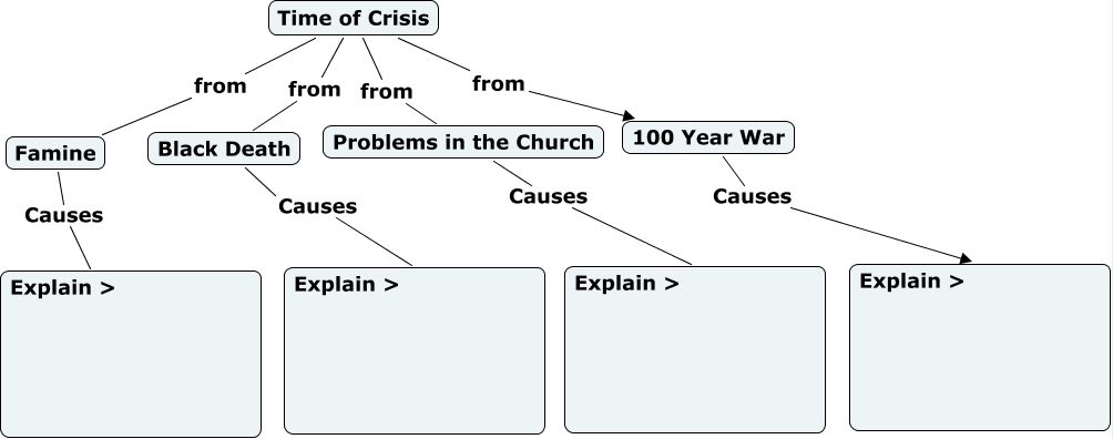 This Concept Map, created with IHMC CmapTools, has information related to: Time of Crisis, Problems in the Church Causes Explain >, Black Death Causes Explain >, Time of Crisis from 100 Year War, Time of Crisis from Famine, 100 Year War Causes Explain >, Famine Causes Explain >, Time of Crisis from Problems in the Church, Time of Crisis from Black Death