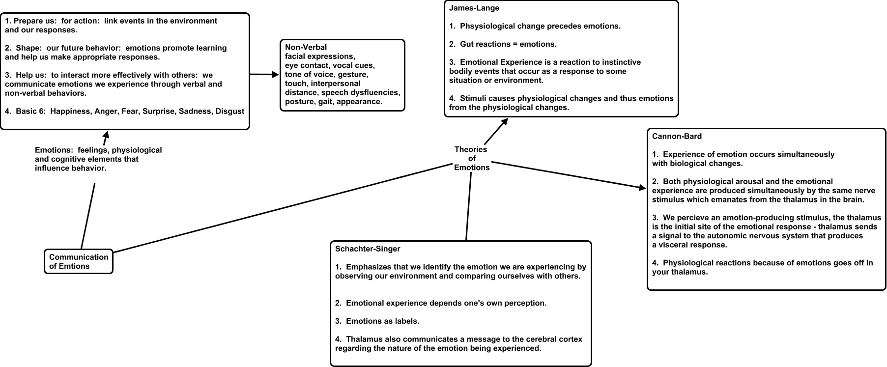 This Concept Map, created with IHMC CmapTools, has information related to: Communication of Emotions, Communication of Emtions Emotions: feelings, physiological and cognitive elements that influence behavior. 1. Prepare us: for action: link events in the environment and our responses. 2. Shape: our future behavior: emotions promote learning and help us make appropriate responses. 3. Help us: to interact more effectively with others: we communicate emotions we experience through verbal and non-verbal behaviors. 4. Basic 6: Happiness, Anger, Fear, Surprise, Sadness, Disgust, Communication of Emtions Theories of Emotions James-Lange 1. Phsysiological change precedes emotions. 2. Gut reactions = emotions. 3. Emotional Experience is a reaction to instinctive bodily events that occur as a response to some situation or environment. 4. Stimuli causes physiological changes and thus emotions from the physiological changes., Communication of Emtions Theories of Emotions Cannon-Bard 1. Experience of emotion occurs simultaneously with biological changes. 2. Both physiological arousal and the emotional experience are produced simultaneously by the same nerve stimulus which emanates from the thalamus in the brain. 3. We percieve an amotion-producing stimulus, the thalamus is the initial site of the emotional response - thalamus sends a signal to the autonomic nervous system that produces a visceral response. 4. Physiological reactions because of emotions goes off in your thalamus., 1. Prepare us: for action: link events in the environment and our responses. 2. Shape: our future behavior: emotions promote learning and help us make appropriate responses. 3. Help us: to interact more effectively with others: we communicate emotions we experience through verbal and non-verbal behaviors. 4. Basic 6: Happiness, Anger, Fear, Surprise, Sadness, Disgust ???? Non-Verbal facial expressions, eye contact, vocal cues, tone of voice, gesture, touch, interpersonal distance, speech dysfluencies, posture, gait, appearance., Communication of Emtions Theories of Emotions Schachter-Singer 1. Emphasizes that we identify the emotion we are experiencing by observing our environment and comparing ourselves with others. 2. Emotional experience depends one's own perception. 3. Emotions as labels. 4. Thalamus also communicates a message to the cerebral cortex regarding the nature of the emotion being experienced.