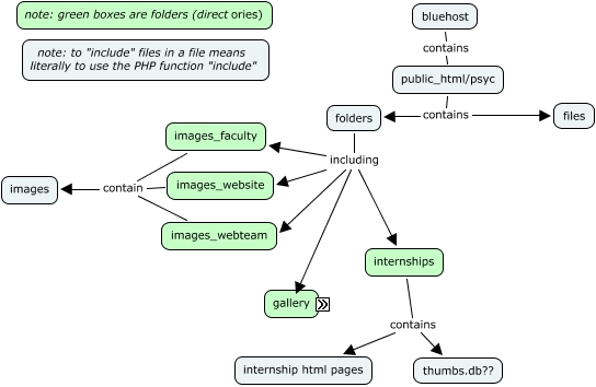 This Concept Map, created with IHMC CmapTools, has information related to: Contents of psyc Directory, gallery contains gallery_footer, index.php includes gallery_header, gallery contains images, folders including images_webteam, images_faculty contain images, gallery contains styles, folders including images_website, folders including images_faculty, images contains student photos, public_html/psyc contains folders, index.php includes gallery_footer, internships contains internship html pages, gallery_header uses styles, gallery contains gallery_header, bluehost contains public_html/psyc, public_html/psyc contains files, images_website contain images, internships contains thumbs.db??, folders including internships, images_webteam contain images