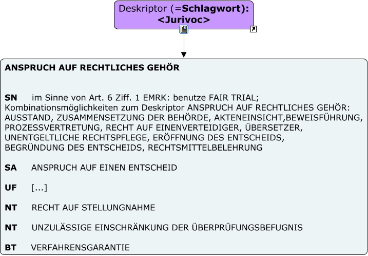 This Concept Map, created with IHMC CmapTools, has information related to: BGE_Jurivoc, Deskriptor (=Schlagwort): <Jurivoc> ANSPRUCH AUF RECHTLICHES GEHÖR SN im Sinne von Art. 6 Ziff. 1 EMRK: benutze FAIR TRIAL; Kombinationsmöglichkeiten zum Deskriptor ANSPRUCH AUF RECHTLICHES GEHÖR: AUSSTAND, ZUSAMMENSETZUNG DER BEHÖRDE, AKTENEINSICHT,BEWEISFÜHRUNG, PROZESSVERTRETUNG, RECHT AUF EINENVERTEIDIGER, ÜBERSETZER, UNENTGELTLICHE RECHTSPFLEGE, ERÖFFNUNG DES ENTSCHEIDS, BEGRÜNDUNG DES ENTSCHEIDS, RECHTSMITTELBELEHRUNG SA ANSPRUCH AUF EINEN ENTSCHEID UF [...] NT RECHT AUF STELLUNGNAHME NT UNZULÄSSIGE EINSCHRÄNKUNG DER ÜBERPRÜFUNGSBEFUGNIS BT VERFAHRENSGARANTIE