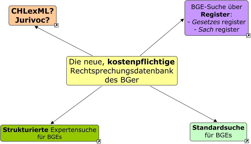 This Concept Map, created with IHMC CmapTools, has information related to: Einstieg, Die neue, kostenpflichtige Rechtsprechungsdatenbank des BGer Strukturierte Expertensuche für BGEs, Die neue, kostenpflichtige Rechtsprechungsdatenbank des BGer BGE-Suche über Register: - Gesetzesregister - Sachregister, Die neue, kostenpflichtige Rechtsprechungsdatenbank des BGer Standardsuche für BGEs, Die neue, kostenpflichtige Rechtsprechungsdatenbank des BGer CHLexML? Jurivoc?