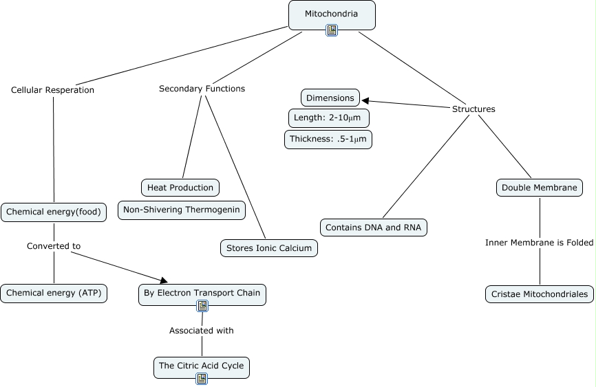 This Concept Map, created with IHMC CmapTools, has information related to: Mitochondrion-Red, Mitochondria Structures Dimensions, Mitochondria Secondary Functions Stores Ionic Calcium, Double Membrane Inner Membrane is Folded Cristae Mitochondriales, Chemical energy(food) Converted to By Electron Transport Chain, Mitochondria Cellular Resperation Chemical energy(food), Mitochondria Structures Contains DNA and RNA, By Electron Transport Chain Associated with The Citric Acid Cycle, Mitochondria Structures Double Membrane, Chemical energy(food) Converted to Chemical energy (ATP), Mitochondria Secondary Functions Heat Production