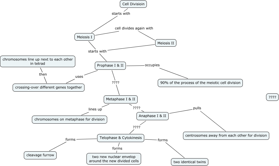 This Concept Map, created with IHMC CmapTools, has information related to: meiosis I & II JK, Anaphase I & II ???? Telophase & Cytokinesis, Prophase I & II ???? Metaphase I & II, Cell Divisioin starts with Meiosis I, Anaphase I & II pulls centrosomes away from each other for division, Meiosis I cell divides again with Meiosis II, Metaphase I & II ???? Anaphase I & II, Prophase I & II uses crossing-over different genes together, Meiosis II starts with Prophase I & II, Metaphase I & II lines up chromosomes on metaphase for division, Telophase & Cytokinesis forms two identical twins, Telophase & Cytokinesis forms cleavage furrow, Meiosis I starts with Prophase I & II, Prophase I & II occupies 90% of the process of the meiotic cell division, Telophase & Cytokinesis forms two new nuclear envelop around the new divided cells, chromosomes line up next to each other in tetrad then crossing-over different genes together