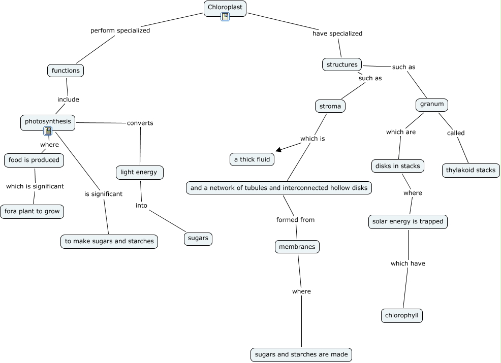 This Concept Map, created with IHMC CmapTools, has information related to: Chloroplast green, Chloroplast perform specialized functions, photosynthesis where food is produced, structures such as granum, light energy into sugars, stroma which is and a network of tubules and interconnected hollow disks, Chloroplast have specialized structures, food is produced which is significant fora plant to grow, disks in stacks where solar energy is trapped, solar energy is trapped which have chlorophyll, photosynthesis is significant to make sugars and starches, functions include photosynthesis, structures such as stroma, photosynthesis converts light energy, membranes where sugars and starches are made, stroma which is a thick fluid, and a network of tubules and interconnected hollow disks formed from membranes, granum which are disks in stacks, granum called thylakoid stacks