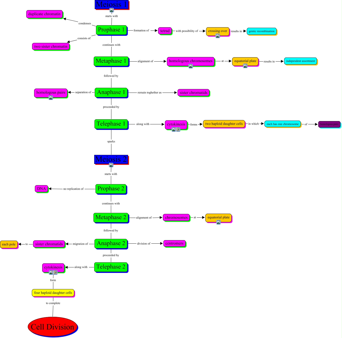 This Concept Map, created with IHMC CmapTools, has information related to: Meiosis + RS, homologous chromosomes at equatorial plate, Telephase 1 along with cytokinesis, Anaphase 2 migration of sister chromatids, Meiosis 2 starts with Prophase 2, Telephase 1 sparks Meiosis 2, sister chromatids to each pole, each has one chromosome of homologous pairs, Prophase 2 continues with Metaphase 2, Anaphase 2 proceeded by Telephase 2, two haploid daughter cells in which each has one chromosome, Metaphase 1 alignment of homologous chromosomes, Telephase 2 along with cytokinesis, crossing over results in gentic recombination, Anaphase 1 remain toghether as sister chromatids, cytokinesis forms two haploid daughter cells, Anaphase 1 proceeded by Telephase 1, Prophase 1 condenses duplicate chromatin, tetrad with possibility of crossing over, Prophase 1 continues with Metaphase 1, Prophase 1 formation of tetrad