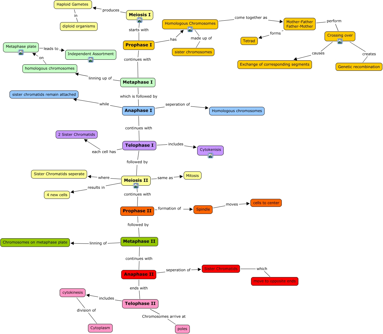 This Concept Map, created with IHMC CmapTools, has information related to: Meiosis I + II OB, Homologous Chromosomes made up of sister chromosomes, Telophase II Chromosomes arrive at poles, Metaphase I which is followed by Anaphase I, Meiosis I starts with Prophase I, Meiosis II results in 4 new cells, cytokinesis division of Cytoplasm, Crossing over creates Genetic recombination, Telophase II includes cytokinesis, Crossing over causes Exchange of corresponding segments, Anaphase I seperation of Homologous chromosomes, Meiosis II where Sister Chromatids seperate, Meiosis II continues with Prophase II, Metaphase I linning up of homologous chromosomes, Prophase I continues with Metaphase I, homologous chromosomes on Metaphase plate, Telophase I each cell has 2 Sister Chromatids, Meiosis II same as Mitosis, Mother-Father Father-Mother forms Tetrad, Telophase I followed by Meiosis II, Meiosis I produces Haploid Gametes