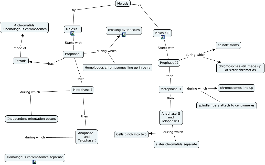This Concept Map, created with IHMC CmapTools, has information related to: Meiosis DC BM, Metaphase II then Anaphase II and Telophase II, Anaphase II and Telophase II during which Cells pinch into two, Meiosis I Starts with Prophase I, Prophase II during which spindle forms, Anaphase I and Telophase I during which Homologous chromosomes separate, Metaphase I then Anaphase I and Telophase I, Metaphase II during which chromosomes line up, Anaphase II and Telophase II during which sister chromatids separate, Meiosis II Starts with Prophase II, Meiosis by Meiosis II, Prophase II then Metaphase II, Prophase I has Tetrads, Metaphase II during which spindle fibers attach to centromeres, Prophase I then Metaphase I, Prophase I during which Homologous chromosomes line up in pairs, Prophase I during which crossing over occurs, Metaphase I during which Independent orientation occurs, Tetrads made of 4 chromatids 2 homologous chromosomes, Prophase II during which chromosomes still made up of sister chromatids, Meiosis by Meiosis I