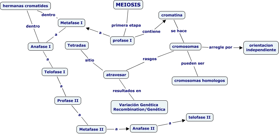 Este Cmap, tiene información relacionada con: Meiosis, Metafase II a Anafase II, cromosomas arregle por orientacion independiente, hermanas cromatides dentro Metafase I, profase I a Metafase I, profase I contiene cromatina, Telofase I a Profase II, Anafase II a telofase II, MEIOSIS primera etapa profase I, Metafase I a Anafase I, Tetradas sitio atravesar, atravesar resultados en Variación Genética Recombination/Genética, hermanas cromatides dentro Anafase I, Profase II a Metafase II, cromosomas pueden ser cromosomas homologos, cromatina se hace cromosomas, Anafase I a Telofase I, cromosomas rasgos atravesar