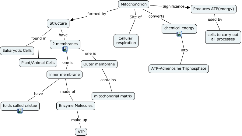 This Concept Map, created with IHMC CmapTools, has information related to: Mitochondrion Green, Produces ATP(energy) used by cells to carry out all processes, Mitochondrion Site of Cellular respiration, Mitochondrion Significance Produces ATP(energy), inner membrane have folds called cristae, Mitochondrion formed by Structure, Outer membrane contains mitochondrial matrix, chemical energy into ATP-Adnenosine Triphosphate, 2 membranes one is inner membrane, Mitochondrion converts chemical energy, inner membrane made of Enzyme Molecules, Structure found in Plant/Animal Cells, Structure have 2 membranes, Enzyme Molecules make up ATP, 2 membranes one is Outer membrane, Structure found in Eukaryotic Cells
