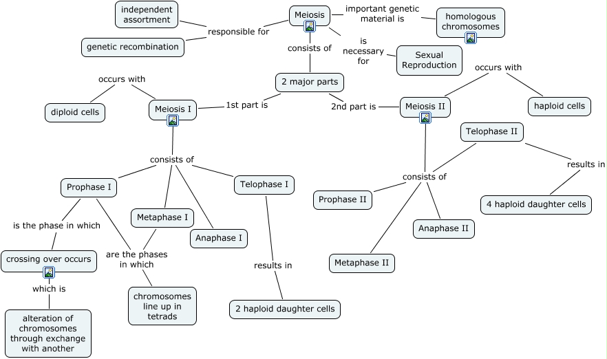 This Concept Map, created with IHMC CmapTools, has information related to: Meiosis, Meiosis II consists of Anaphase II, Meiosis I consists of Anaphase I, Meiosis is necessary for Sexual Reproduction, Prophase I are the phases in which chromosomes line up in tetrads, Meiosis II consists of Metaphase II, Telophase I results in 2 haploid daughter cells, Meiosis II consists of Prophase II, Meiosis II occurs with haploid cells, 2 major parts 2nd part is Meiosis II, Telophase II results in 4 haploid daughter cells, Meiosis consists of 2 major parts, Meiosis responsible for independent assortment, Meiosis I consists of Metaphase I, Prophase I is the phase in which crossing over occurs, 2 major parts 1st part is Meiosis I, Meiosis I occurs with diploid cells, Meiosis important genetic material is homologous chromosomes, Meiosis responsible for genetic recombination, Meiosis I consists of Telophase I, Meiosis I consists of Prophase I