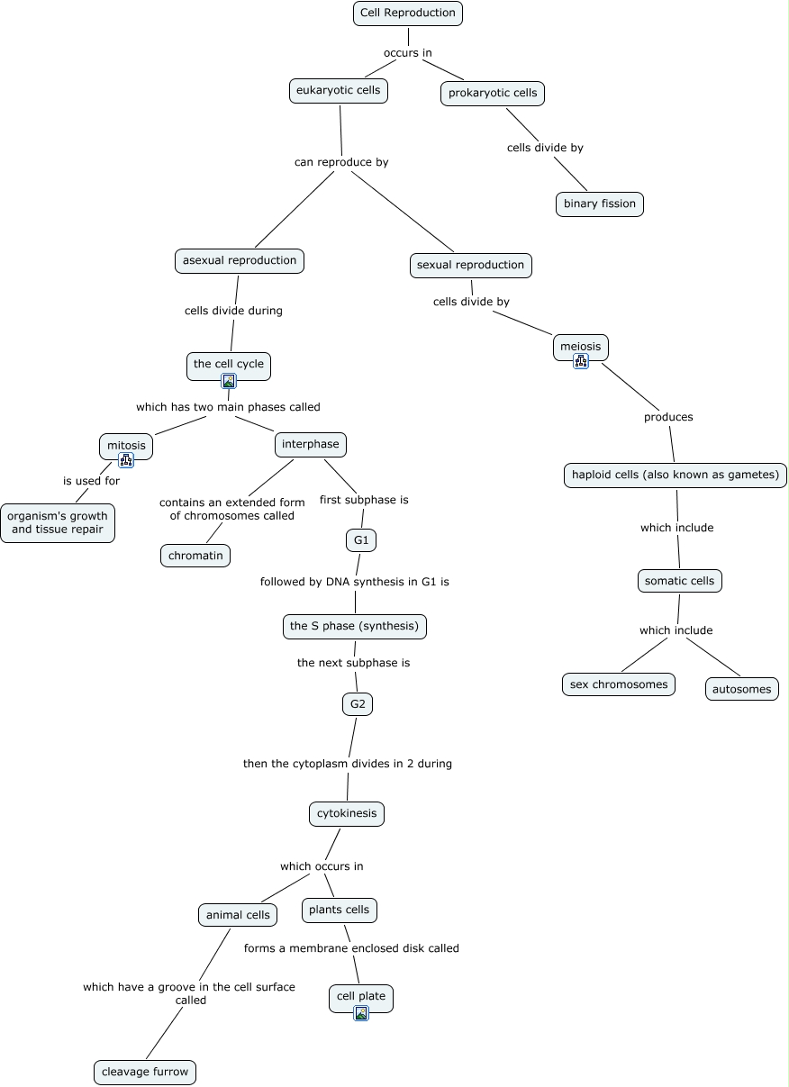 This Concept Map, created with IHMC CmapTools, has information related to: Cell Repro JS RR, asexual reproduction cells divide during the cell cycle, the S phase (synthesis) the next subphase is G2, animal cells which have a groove in the cell surface called cleavage furrow, eukaryotic cells can reproduce by sexual reproduction, G2 then the cytoplasm divides in 2 during cytokinesis, interphase first subphase is G1, plants cells forms a membrane enclosed disk called cell plate, haploid cells (also known as gametes) which include somatic cells, interphase which has two main phases called mitosis, cytokinesis which occurs in plants cells, somatic cells which include autosomes, mitosis is used for organism's growth and tissue repair, eukaryotic cells can reproduce by asexual reproduction, Cell Reproduction occurs in prokaryotic cells, G1 followed by DNA synthesis in G1 is the S phase (synthesis), meiosis produces haploid cells (also known as gametes), somatic cells which include sex chromosomes, interphase contains an extended form of chromosomes called chromatin, sexual reproduction cells divide by meiosis, the cell cycle which has two main phases called mitosis