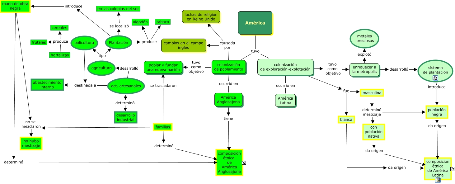 This Concept Map, created with IHMC CmapTools, has information related to: colonizacion de america, policultura produce cereales, familias determinó población blanca, poblar y fundar una nueva nación desarrolló agricultura, mano de obra negra determinó población negra, América Anglosajona tiene población negra, mano de obra negra no se mezclaron no hubo mestizaje, América tuvo colonización de exploración-explotación, Plantación introduce mano de obra negra, familias no se mezclaron no hubo mestizaje, colonización de exploración-explotación ocurrió en América Latina, Plantación produce tabaco, act. artesanales determinó desarrollo industrial, colonización de exploración-explotación fue masculina, colonización de poblamiento causada por luchas de religión en Reino Unido, Plantación produce algodón, masculina determinó mestizaje con población nativa, colonización de poblamiento tuvo como objetivo poblar y fundar una nueva nación, colonización de exploración-explotación tuvo como objetivo enriquecer a la metrópolis, policultura produce hortalizas, agricultura tipo Plantación
