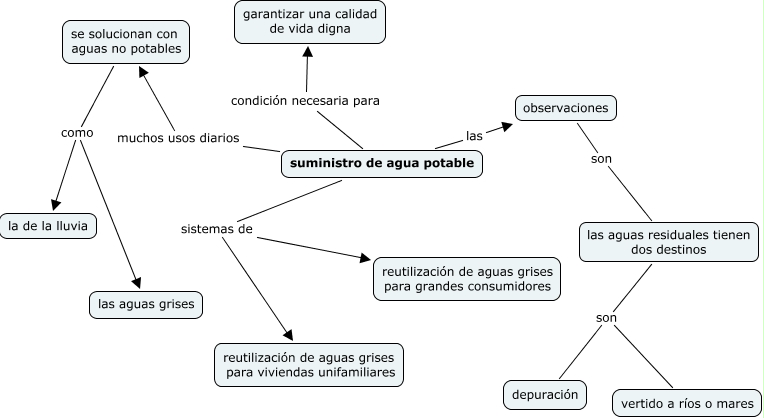 This Concept Map, created with IHMC CmapTools, has information related to: 04_suministro agua potable, suministro de agua potable sistemas de reutilización de aguas grises para grandes consumidores, las aguas residuales tienen dos destinos son vertido a ríos o mares, suministro de agua potable sistemas de reutilización de aguas grises para viviendas unifamiliares, suministro de agua potable las observaciones, suministro de agua potable muchos usos diarios se solucionan con aguas no potables, se solucionan con aguas no potables como la de la lluvia, se solucionan con aguas no potables como las aguas grises, observaciones son las aguas residuales tienen dos destinos, suministro de agua potable condición necesaria para garantizar una calidad de vida digna, las aguas residuales tienen dos destinos son depuración