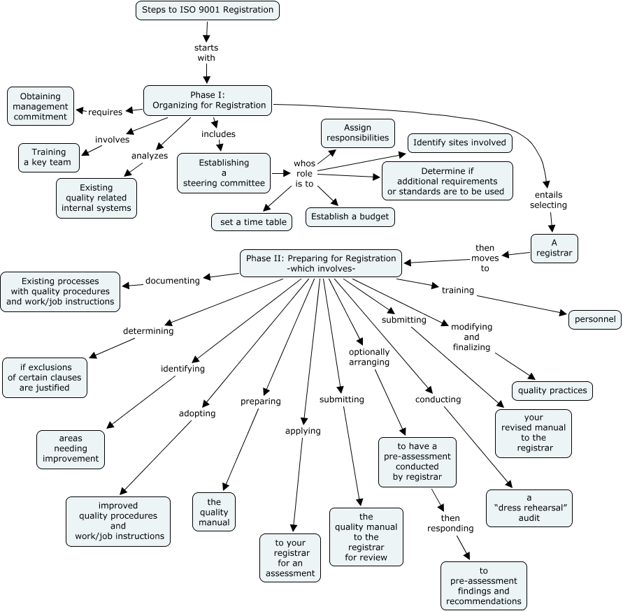 This Concept Map, created with IHMC CmapTools, has information related to: Steps to ISO 9001 Registration, A registrar then moves to Phase II: Preparing for Registration -which involves-, Phase II: Preparing for Registration -which involves- adopting improved quality procedures and work/job instructions, Phase II: Preparing for Registration -which involves- conducting a “dress rehearsal” audit, Phase II: Preparing for Registration -which involves- optionally arranging to have a pre-assessment conducted by registrar, Establishing a steering committee whos role is to set a time table, Phase I: Organizing for Registration involves Training a key team, Phase II: Preparing for Registration -which involves- training personnel, Phase I: Organizing for Registration requires Obtaining management commitment, Phase II: Preparing for Registration -which involves- modifying and finalizing quality practices, Phase II: Preparing for Registration -which involves- applying to your registrar for an assessment, to have a pre-assessment conducted by registrar then responding to pre-assessment findings and recommendations, Phase I: Organizing for Registration analyzes Existing quality related internal systems, Phase II: Preparing for Registration -which involves- identifying areas needing improvement, Establishing a steering committee whos role is to Identify sites involved, Phase II: Preparing for Registration -which involves- submitting the quality manual to the registrar for review, Establishing a steering committee whos role is to Determine if additional requirements or standards are to be used, Steps to ISO 9001 Registration starts with Phase I: Organizing for Registration, Phase II: Preparing for Registration -which involves- submitting your revised manual to the registrar, Phase II: Preparing for Registration -which involves- documenting Existing processes with quality procedures and work/job instructions, Phase I: Organizing for Registration includes Establishing a steering committee
