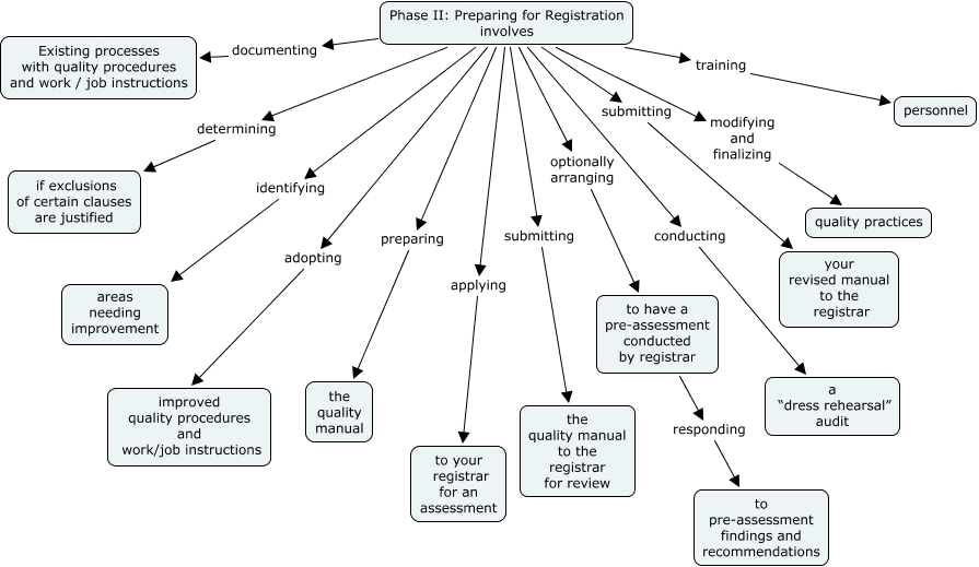 This Concept Map, created with IHMC CmapTools, has information related to: Phase II Preparing for Registration, Phase II: Preparing for Registration involves documenting Existing processes with quality procedures and work / job instructions, Phase II: Preparing for Registration involves optionally arranging to have a pre-assessment conducted by registrar, Phase II: Preparing for Registration involves submitting the quality manual to the registrar for review, Phase II: Preparing for Registration involves preparing the quality manual, Phase II: Preparing for Registration involves conducting a “dress rehearsal” audit, to have a pre-assessment conducted by registrar responding to pre-assessment findings and recommendations, Phase II: Preparing for Registration involves applying to your registrar for an assessment, Phase II: Preparing for Registration involves training personnel, Phase II: Preparing for Registration involves modifying and finalizing quality practices, Phase II: Preparing for Registration involves determining if exclusions of certain clauses are justified, Phase II: Preparing for Registration involves adopting improved quality procedures and work/job instructions, Phase II: Preparing for Registration involves identifying areas needing improvement, Phase II: Preparing for Registration involves submitting your revised manual to the registrar