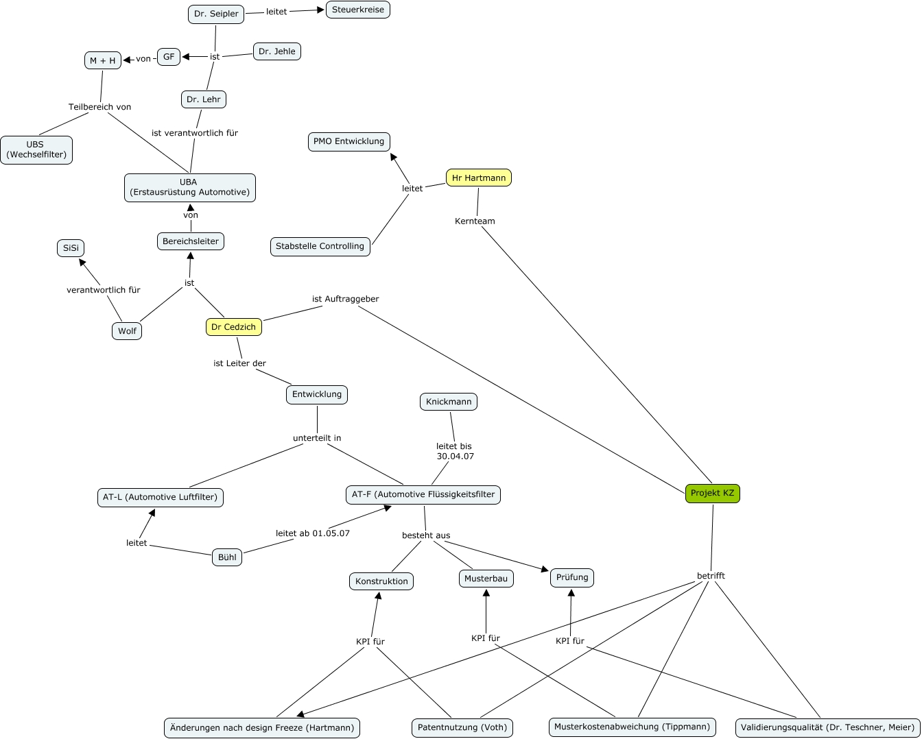 This Concept Map, created with IHMC CmapTools, has information related to: Struktur, Hr Hartmann Kernteam Projekt KZ, Validierungsqualität (Dr. Teschner, Meier) KPI für Prüfung, Dr. Seipler leitet Steuerkreise, Hr Hartmann leitet Stabstelle Controlling, Wolf ist Bereichsleiter, Projekt KZ betrifft Patentnutzung (Voth), Musterkostenabweichung (Tippmann) KPI für Musterbau, Bühl leitet ab 01.05.07 AT-F (Automotive Flüssigkeitsfilter, Dr Cedzich ist Bereichsleiter, Dr Cedzich ist Leiter der Entwicklung, AT-F (Automotive Flüssigkeitsfilter besteht aus Prüfung, Dr Cedzich ist Auftraggeber Projekt KZ, GF von M + H, Patentnutzung (Voth) KPI für Konstruktion, Bühl leitet AT-L (Automotive Luftfilter), Dr. Lehr ist GF, Dr. Lehr ist verantwortlich für UBA (Erstausrüstung Automotive), AT-F (Automotive Flüssigkeitsfilter besteht aus Konstruktion, Projekt KZ betrifft Änderungen nach design Freeze (Hartmann), Bereichsleiter von UBA (Erstausrüstung Automotive)