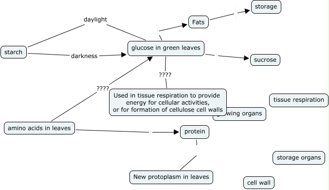 This Concept Map, created with IHMC CmapTools, has information related to: Fate of Glucose, glucose in green leaves Fats, Fats storage, amino acids in leaves protein, amino acids in leaves ???? glucose in green leaves, glucose in green leaves daylight starch, starch darkness glucose in green leaves, protein New protoplasm in leaves, glucose in green leaves sucrose, glucose in green leaves ???? Used in tissue respiration to provide energy for cellular activities, or for formation of cellulose cell walls