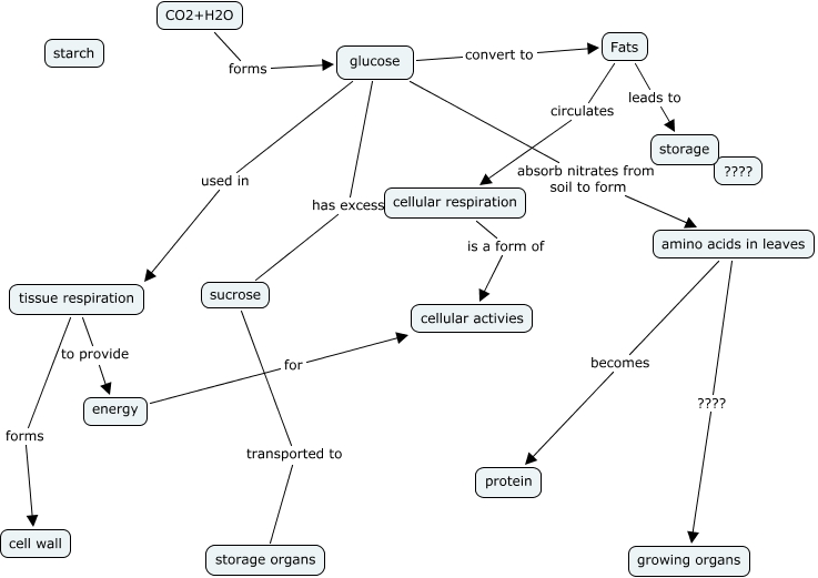 This Concept Map, created with IHMC CmapTools, has information related to: Fate of Glucose, glucose has excess sucrose, sucrose transported to storage organs, Fats leads to storage, CO2+H2O forms glucose, amino acids in leaves ???? growing organs, Fats circulates cellular respiration, glucose absorb nitrates from soil to form amino acids in leaves, amino acids in leaves becomes protein, glucose convert to Fats, glucose used in tissue respiration, tissue respiration to provide energy, cellular respiration is a form of cellular activies, energy for cellular activies, tissue respiration forms cell wall
