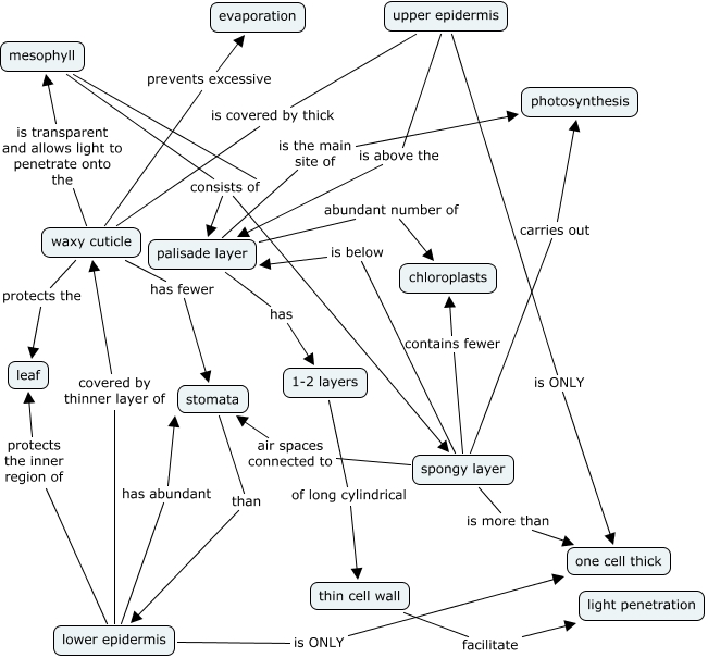 This Concept Map, created with IHMC CmapTools, has information related to: Leaf Structure, spongy layer is below palisade layer, stomata than lower epidermis, mesophyll consists of palisade layer, mesophyll consists of spongy layer, lower epidermis protects the inner region of leaf, palisade layer is the main site of photosynthesis, upper epidermis is ONLY one cell thick, waxy cuticle is transparent and allows light to penetrate onto the mesophyll, waxy cuticle has fewer stomata, mesophyll consists of spongy layer, spongy layer air spaces connected to stomata, lower epidermis covered by thinner layer of waxy cuticle, lower epidermis is ONLY one cell thick, mesophyll consists of palisade layer, 1-2 layers of long cylindrical thin cell wall, palisade layer has 1-2 layers, waxy cuticle protects the leaf, waxy cuticle prevents excessive evaporation, spongy layer carries out photosynthesis, lower epidermis has abundant stomata