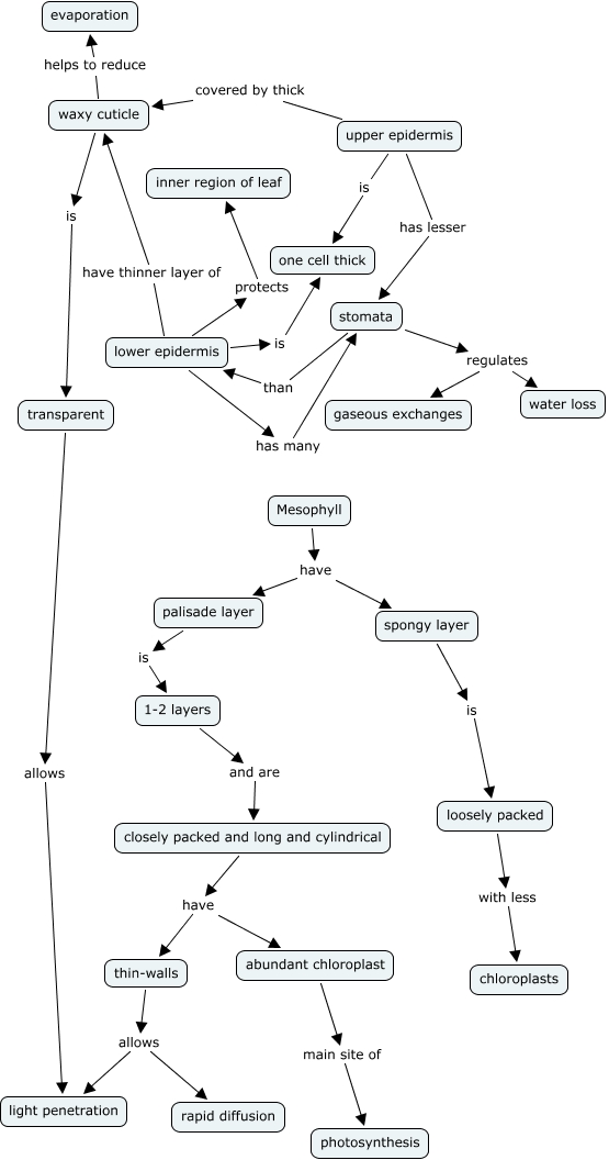 This Concept Map, created with IHMC CmapTools, has information related to: Leaf Structure, abundant chloroplast main site of photosynthesis, closely packed and long and cylindrical have abundant chloroplast, loosely packed with less chloroplasts, stomata than lower epidermis, lower epidermis is one cell thick, stomata regulates water loss, transparent allows light penetration, upper epidermis is one cell thick, waxy cuticle helps to reduce evaporation, 1-2 layers and are closely packed and long and cylindrical, closely packed and long and cylindrical have thin-walls, palisade layer is 1-2 layers, upper epidermis covered by thick waxy cuticle, lower epidermis has many stomata, lower epidermis have thinner layer of waxy cuticle, thin-walls allows light penetration, lower epidermis protects inner region of leaf, upper epidermis has lesser stomata, waxy cuticle is transparent, Mesophyll have spongy layer