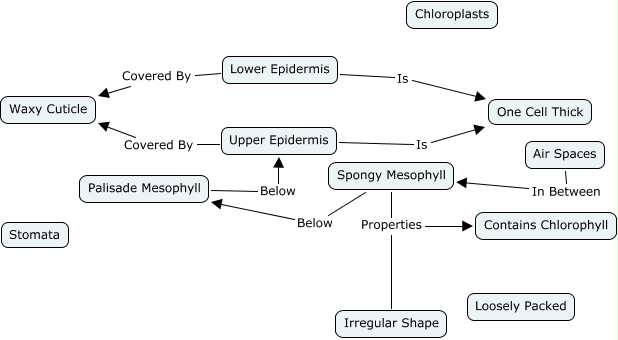 This Concept Map, created with IHMC CmapTools, has information related to: Leaf Structure, Lower Epidermis Covered By Waxy Cuticle, Upper Epidermis Covered By Waxy Cuticle, Spongy Mesophyll Below Palisade Mesophyll, Spongy Mesophyll Properties Contains Chlorophyll, Upper Epidermis Is One Cell Thick, Lower Epidermis Is One Cell Thick, Palisade Mesophyll Below Upper Epidermis, Air Spaces In Between Spongy Mesophyll, Spongy Mesophyll Properties Irregular Shape