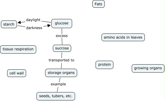 This Concept Map, created with IHMC CmapTools, has information related to: Fate of Glucose, glucose daylight starch, starch darkness glucose, glucose excess sucrose, sucrose transported to storage organs, storage organs example seeds, tubers, etc.