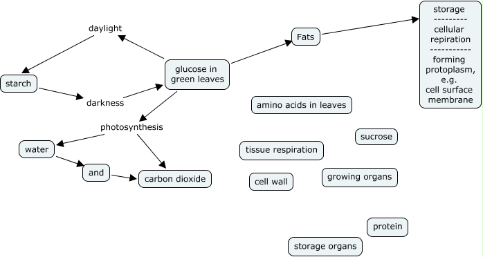 This Concept Map, created with IHMC CmapTools, has information related to: Fate of Glucose_5,28, glucose in green leaves photosynthesis carbon dioxide, Fats ???? storage --------- cellular repiration ----------- forming protoplasm, e.g. cell surface membrane, glucose in green leaves ???? Fats, glucose in green leaves photosynthesis water, water ???? and, and ???? carbon dioxide, glucose in green leaves daylight starch, starch darkness glucose in green leaves