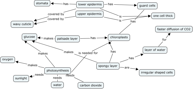 This Concept Map, created with IHMC CmapTools, has information related to: Leaf Structure, photosynthesis makes glucose, photosynthesis needs carbon dioxide, layer of water for faster diffusion of CO2, photosynthesis needs sunlight, lower epidermis covered by waxy cuticle, photosynthesis needs water, palisade layer makes glucose, lower epidermis is one cell thick, spongy layer has chloroplasts, spongy layer has layer of water, palisade layer has chloroplasts, upper epidermis covered by waxy cuticle, upper epidermis is one cell thick, photosynthesis makes oxygen, spongy layer makes glucose, chloroplasts is needed for photosynthesis, lower epidermis has guard cells, lower epidermis has stomata, spongy layer are irregular shaped cells, guard cells has chloroplasts