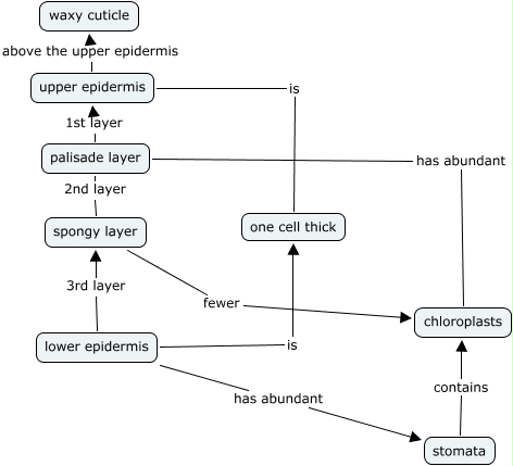 This Concept Map, created with IHMC CmapTools, has information related to: Leaf Structure, spongy layer fewer chloroplasts, spongy layer 2nd layer palisade layer, upper epidermis is one cell thick, lower epidermis has abundant stomata, palisade layer 1st layer upper epidermis, lower epidermis is one cell thick, upper epidermis above the upper epidermis waxy cuticle, stomata contains chloroplasts, lower epidermis 3rd layer spongy layer, palisade layer has abundant chloroplasts