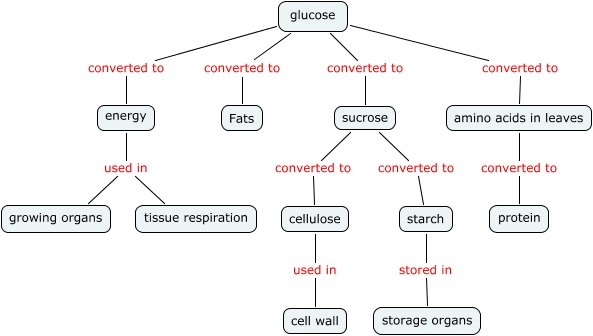 This Concept Map, created with IHMC CmapTools, has information related to: Fate of Glucose, amino acids in leaves converted to protein, glucose converted to amino acids in leaves, energy used in tissue respiration, sucrose converted to starch, glucose converted to energy, cellulose used in cell wall, sucrose converted to cellulose, starch stored in storage organs, glucose converted to Fats, glucose converted to sucrose, energy used in growing organs