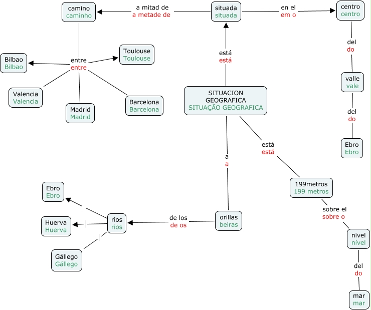 This Concept Map, created with IHMC CmapTools, has information related to: situacion geografica, nivel nível del do mar mar, camino caminho entre entre Madrid Madrid, centro centro del do valle vale, SITUACION GEOGRAFICA SITUAÇÃO GEOGRAFICA a a orillas beiras, rios rios Gállego Gállego, valle vale del do Ebro Ebro, SITUACION GEOGRAFICA SITUAÇÃO GEOGRAFICA está está situada situada, orillas beiras de los de os rios rios, 199metros 199 metros sobre el sobre o nivel nível, camino caminho entre entre Toulouse Toulouse, rios rios Huerva Huerva, camino caminho entre entre Bilbao Bilbao, rios rios Ebro Ebro, situada situada en el em o centro centro, camino caminho entre entre Valencia Valencia, situada situada a mitad de a metade de camino caminho, SITUACION GEOGRAFICA SITUAÇÃO GEOGRAFICA está está 199metros 199 metros, camino caminho entre entre Barcelona Barcelona