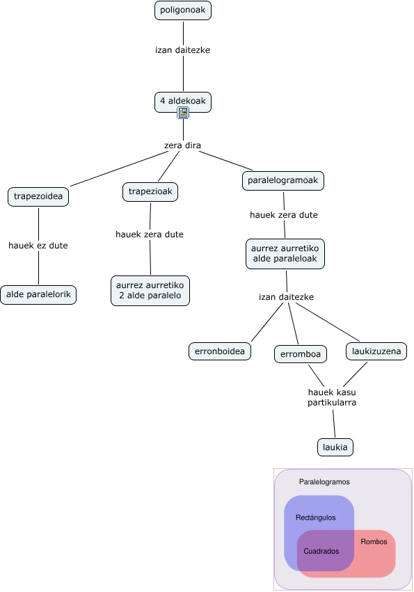 This Concept Map, created with IHMC CmapTools, has information related to: geometriaren hastapenak, aurrez aurretiko alde paraleloak izan daitezke erromboa, paralelogramoak zera dira trapezoidea, poligonoak izan daitezke 4 aldekoak, laukizuzena hauek kasu partikularra laukia, trapezioak hauek zera dute aurrez aurretiko 2 alde paralelo, aurrez aurretiko alde paraleloak izan daitezke erronboidea, aurrez aurretiko alde paraleloak izan daitezke laukizuzena, trapezoidea hauek ez dute alde paralelorik, paralelogramoak hauek zera dute aurrez aurretiko alde paraleloak, paralelogramoak zera dira 4 aldekoak, erromboa hauek kasu partikularra laukia, paralelogramoak zera dira trapezioak