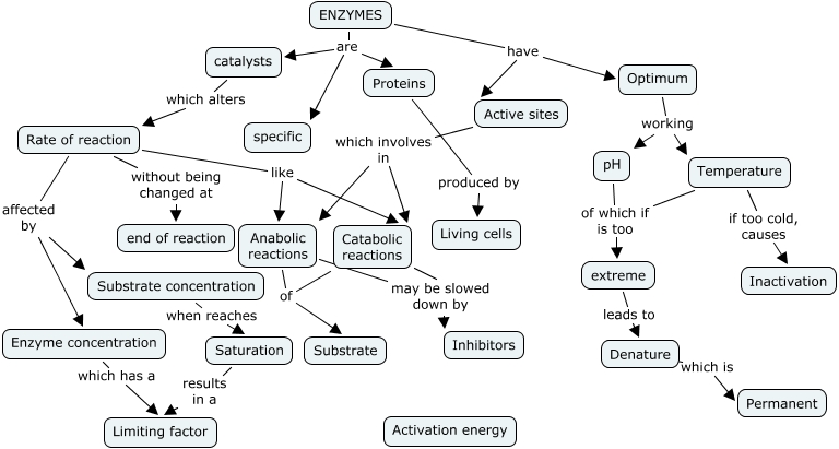 This Concept Map, created with IHMC CmapTools, has information related to: Enzymes pte ltd, ENZYMES are catalysts, Rate of reaction like Anabolic reactions, Rate of reaction without being changed at end of reaction, Saturation results in a Limiting factor, ENZYMES are Proteins, Enzyme concentration which has a Limiting factor, Substrate concentration when reaches Saturation, Proteins produced by Living cells, extreme leads to Denature, Optimum working pH, Rate of reaction affected by Substrate concentration, Anabolic reactions may be slowed down by Inhibitors, Temperature of which if is too extreme, pH of which if is too extreme, Catabolic reactions may be slowed down by Inhibitors, Denature which is Permanent, Optimum working Temperature, Active sites which involves in Anabolic reactions, Anabolic reactions of Substrate, Catabolic reactions of Substrate