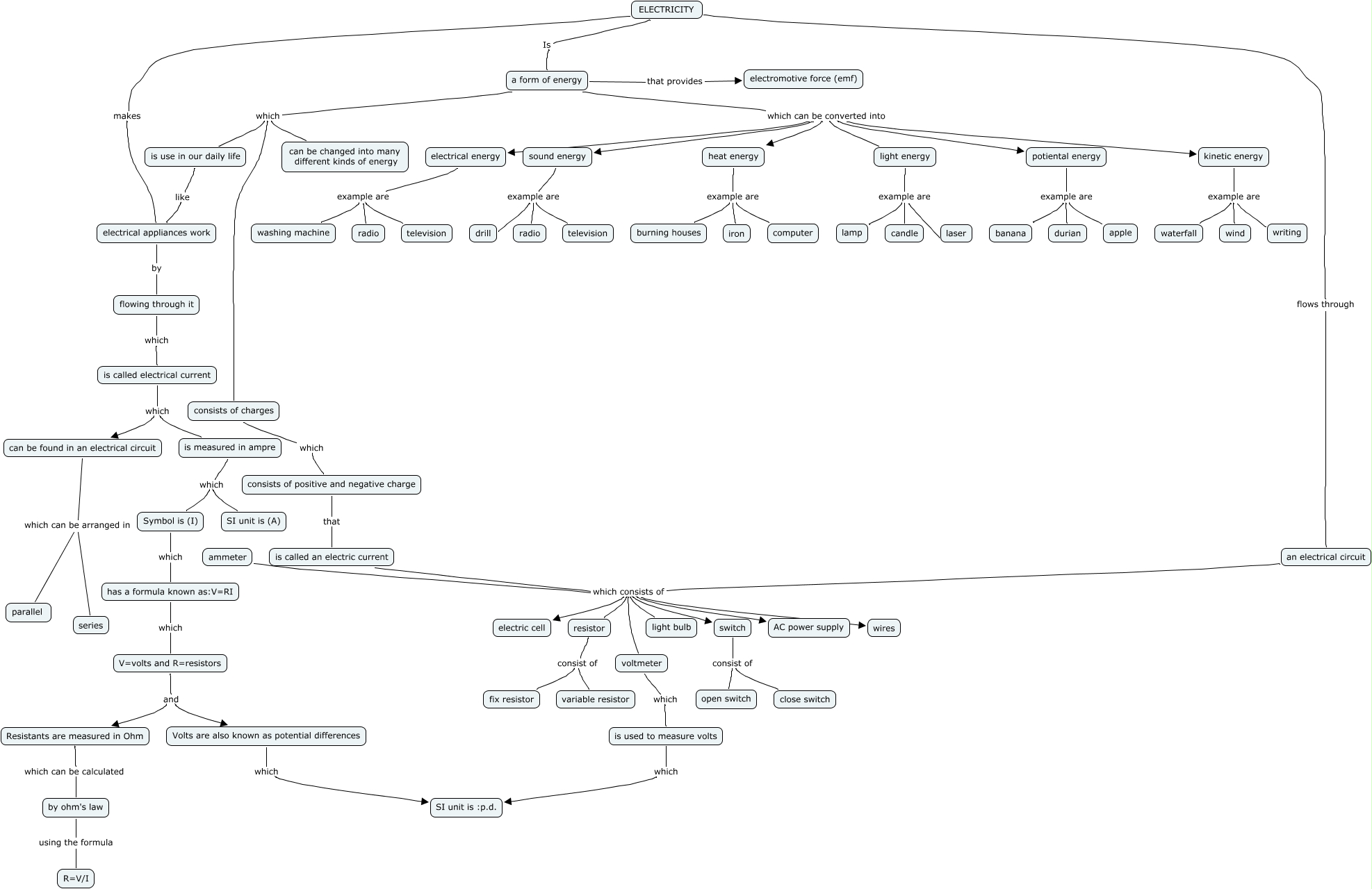 This Concept Map, created with IHMC CmapTools, has information related to: Sec2A_21and 22, heat energy example are iron, kinetic energy example are wind, V=volts and R=resistors and Resistants are measured in Ohm, is used to measure volts which SI unit is :p.d., consists of charges which consists of positive and negative charge, is measured in ampre which Symbol is (I), electrical appliances work by flowing through it, is measured in ampre which SI unit is (A), can be found in an electrical circuit which can be arranged in parallel, an electrical circuit which consists of light bulb, Volts are also known as potential differences which SI unit is :p.d., an electrical circuit which consists of electric cell, a form of energy which can be converted into electrical energy, can be found in an electrical circuit which can be arranged in series, a form of energy which can be changed into many different kinds of energy, flowing through it which is called electrical current, ammeter which consists of voltmeter, a form of energy which consists of charges, resistor consist of variable resistor, an electrical circuit which consists of AC power supply