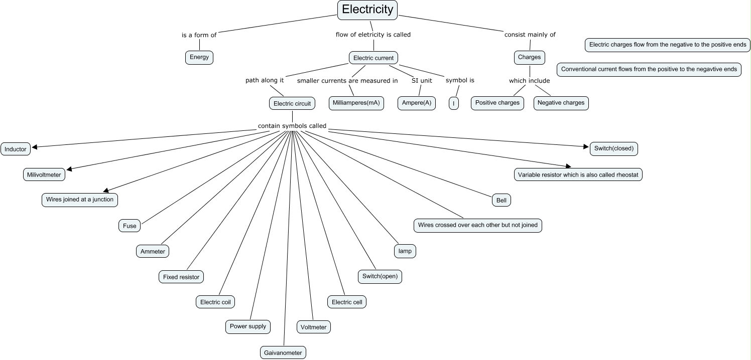 This Concept Map, created with IHMC CmapTools, has information related to: Wat is electricity, Electric circuit contain symbols called Fixed resistor, Electricity consist mainly of Charges, Electric circuit contain symbols called Milivoltmeter, Electric circuit contain symbols called Bell, Electricity is a form of Energy, Electric circuit contain symbols called Fuse, Electric current path along it Electric circuit, Electric circuit contain symbols called Wires crossed over each other but not joined, Electric circuit contain symbols called Voltmeter, Electric circuit contain symbols called Inductor, Electric circuit contain symbols called Wires joined at a junction, Electric circuit contain symbols called Electric coil, Charges which include Negative charges, Electric circuit contain symbols called Switch(open), Electric circuit contain symbols called lamp, Electric circuit contain symbols called Switch(closed), Electric current SI unit Ampere(A), Electric circuit contain symbols called Electric cell, Charges which include Positive charges, Electric circuit contain symbols called Gaivanometer