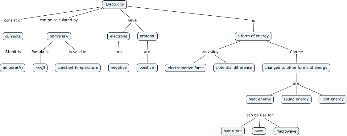 This Concept Map, created with IHMC CmapTools, has information related to: 29 and 30, Electricity have electrons, Electricity consist of currents, electrons are negative, changed to other forms of energy are heat energy, Electricity have protons, Electricity is a form of energy, protons are positive, changed to other forms of energy are light energy, a form of energy Can be changed to other forms of energy, a form of energy providing potential difference, heat energy can be use for hair dryer, ohm's law fomula is r=v/i, heat energy can be use for oven, heat energy can be use for microwave, currents SIunit is ampere(A), a form of energy providing electromotive force, changed to other forms of energy are sound energy, ohm's law is valid in constant temperature, Electricity can be calculated by ohm's law