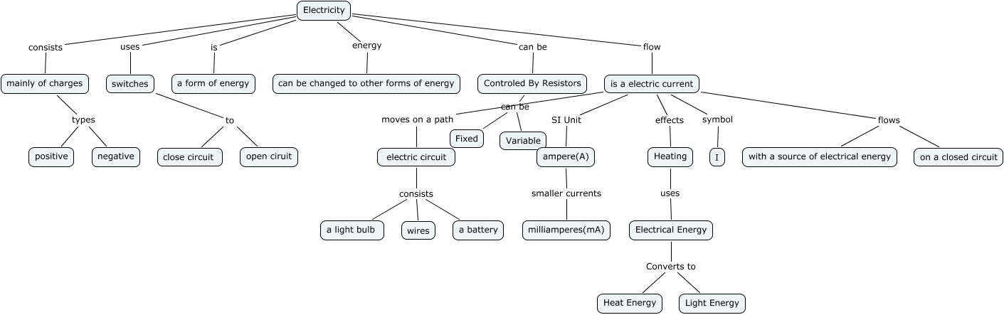 This Concept Map, created with IHMC CmapTools, has information related to: Electricity, is a electric current effects Heating, switches to open ciruit, Electricity consists mainly of charges, is a electric current symbol I, Controled By Resistors can be Fixed, Electricity can be Controled By Resistors, is a electric current flows on a closed circuit, switches to close circuit, is a electric current moves on a path electric circuit, Electrical Energy Converts to Light Energy, is a electric current SI Unit ampere(A), Electricity flow is a electric current, Electrical Energy Converts to Heat Energy, electric circuit consists a light bulb, mainly of charges types positive, electric circuit consists a battery, Electricity uses switches, Heating uses Electrical Energy, Electricity energy can be changed to other forms of energy, ampere(A) smaller currents milliamperes(mA)
