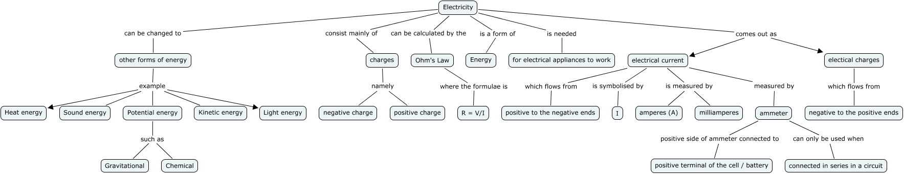 This Concept Map, created with IHMC CmapTools, has information related to: Index 3, 4, electrical current is measured by amperes (A), ammeter can only be used when connected in series in a circuit, Ohm's Law where the formulae is R = V/I, Electricity comes out as electrical current, charges namely negative charge, other forms of energy example Light energy, other forms of energy example Sound energy, Electricity can be calculated by the Ohm's Law, Electricity can be changed to other forms of energy, ammeter positive side of ammeter connected to positive terminal of the cell / battery, Electricity is needed for electrical appliances to work, Potential energy such as Gravitational, electrical current is symbolised by I, electical charges which flows from negative to the positive ends, Electricity is a form of Energy, Potential energy such as Chemical, electrical current which flows from positive to the negative ends, other forms of energy example Potential energy, electrical current is measured by milliamperes, other forms of energy example Heat energy