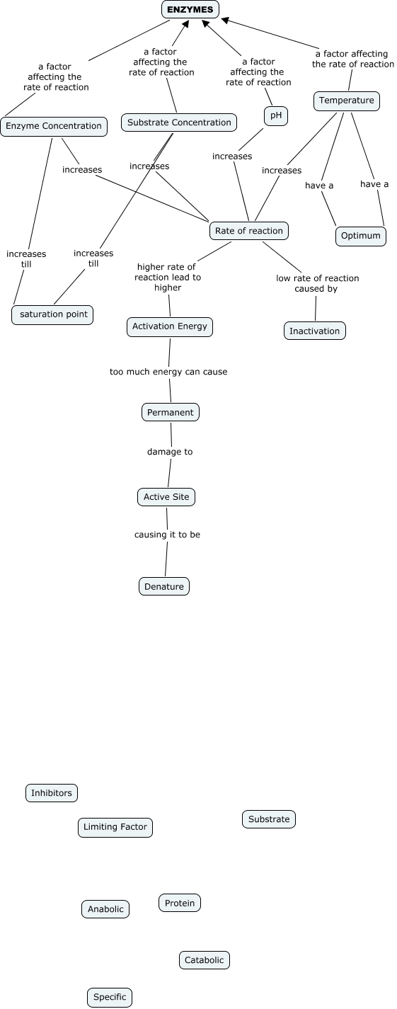 This Concept Map, created with IHMC CmapTools, has information related to: Enzymes(1), Permanent damage to Active Site, Temperature a factor affecting the rate of reaction ENZYMES, Temperature have a Optimum, Substrate Concentration increases till saturation point, Rate of reaction low rate of reaction caused by Inactivation, ENZYMES a factor affecting the rate of reaction Enzyme Concentration, Temperature increases Rate of reaction, Substrate Concentration increases Rate of reaction, Activation Energy too much energy can cause Permanent, Rate of reaction higher rate of reaction lead to higher Activation Energy, Temperature have a Optimum, Substrate Concentration a factor affecting the rate of reaction ENZYMES, Enzyme Concentration increases till saturation point, Enzyme Concentration increases Rate of reaction, pH a factor affecting the rate of reaction ENZYMES, Active Site causing it to be Denature, pH increases Rate of reaction