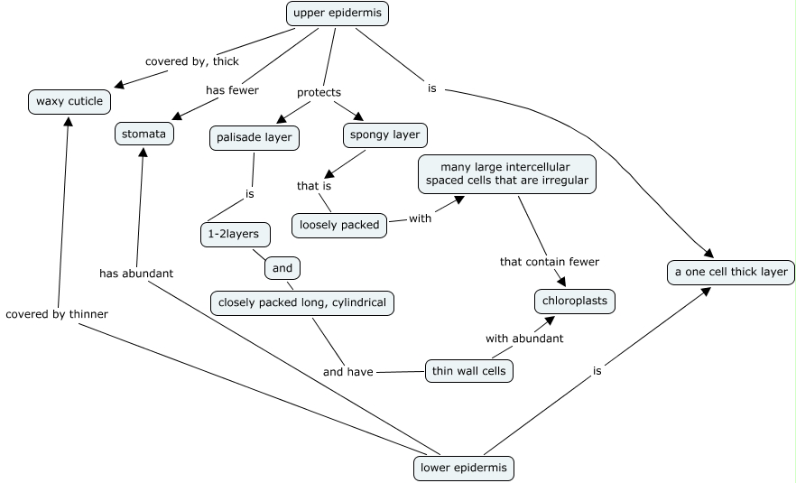 This Concept Map, created with IHMC CmapTools, has information related to: leaf structure_14 and 22, spongy layer that is loosely packed, upper epidermis is a one cell thick layer, palisade layer is 1-2layers, upper epidermis has fewer stomata, upper epidermis covered by, thick waxy cuticle, many large intercellular spaced cells that are irregular that contain fewer chloroplasts, lower epidermis has abundant stomata, lower epidermis covered by thinner waxy cuticle, 1-2layers and closely packed long, cylindrical, upper epidermis protects palisade layer, upper epidermis protects spongy layer, closely packed long, cylindrical and have thin wall cells, lower epidermis is a one cell thick layer, thin wall cells with abundant chloroplasts, loosely packed with many large intercellular spaced cells that are irregular